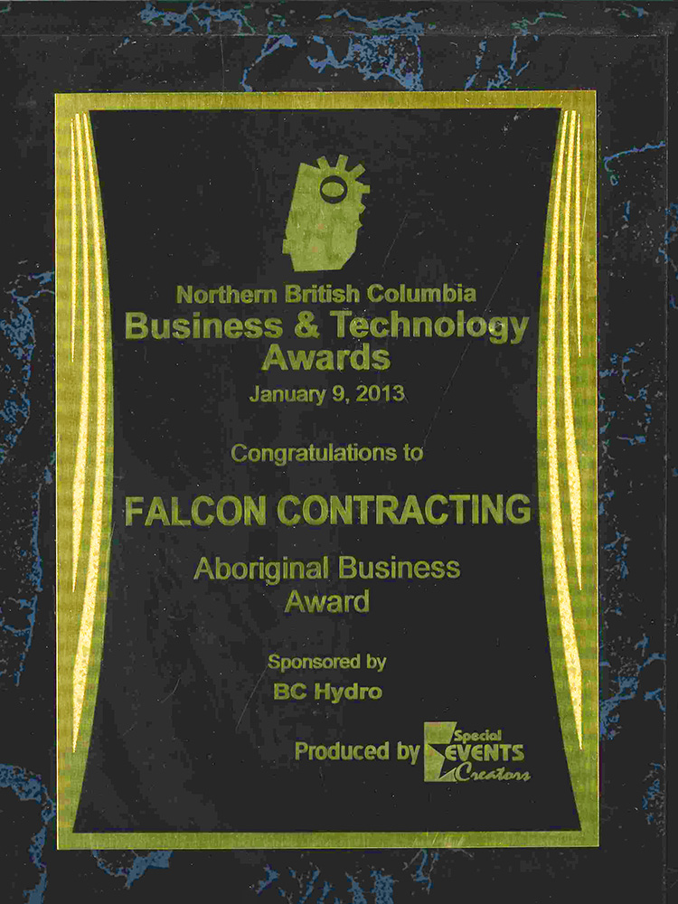 "Falcon Camp Services Inc. is pleased to announce that the remote workforce accommodation company along with heavy civil construction arm, Falcon Contracting Ltd. will be recognized with an Outstanding Achievement Award for First Nations Business of the Year at the fourth annual BC First Nations Business Awards in Vancouver, BC on November 26, 2012.